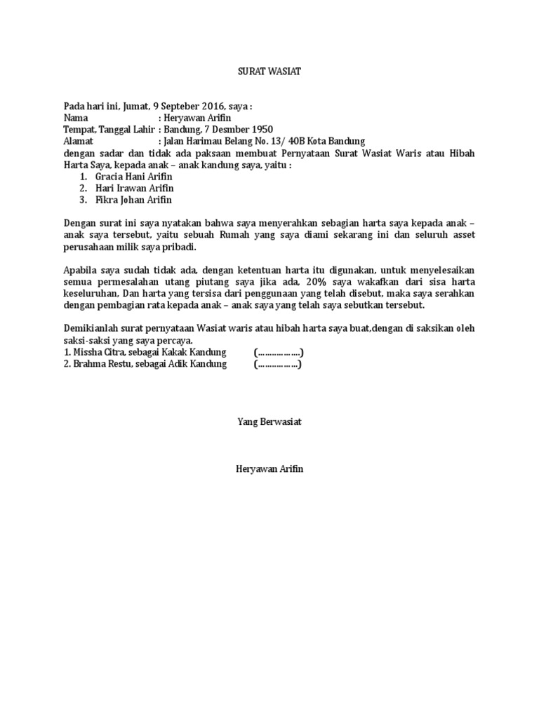 Contoh Surat Wasiat Sebelum Meninggal Pembagiannya Ajaib